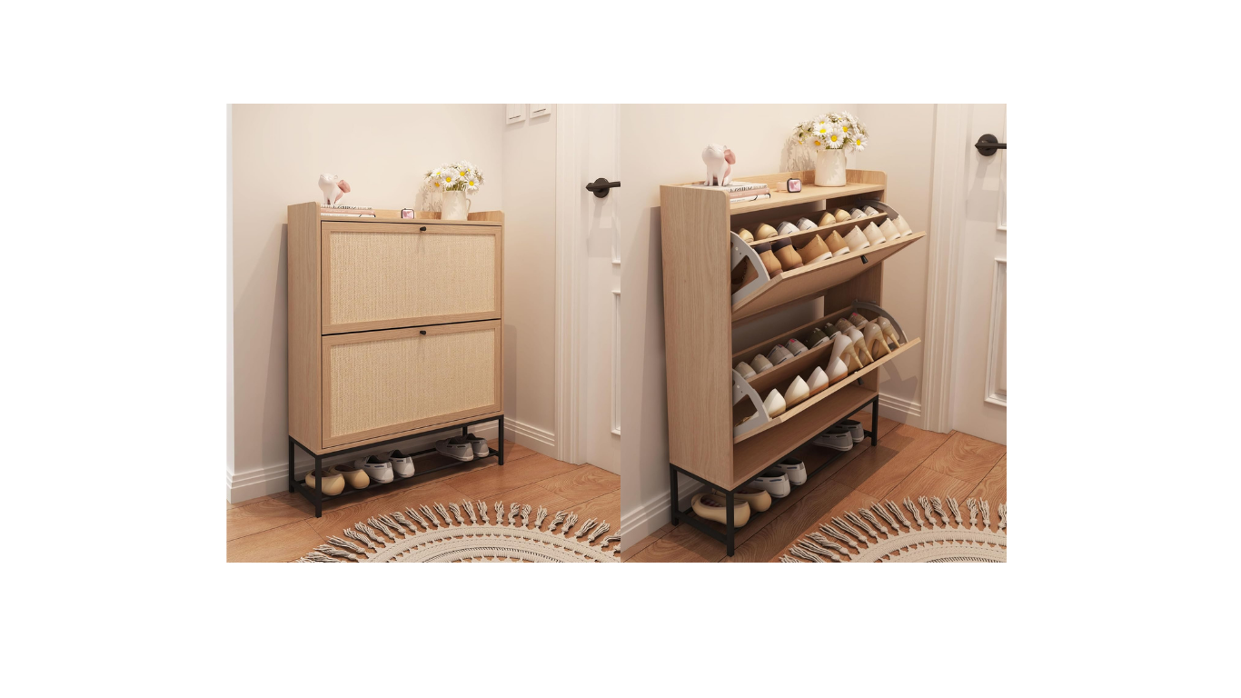 2 Flip Drawers, Freestanding Shoe Cabinet with Natural Linen Panel, Slim Wood Shoe Organizer Closed Shoe Rack